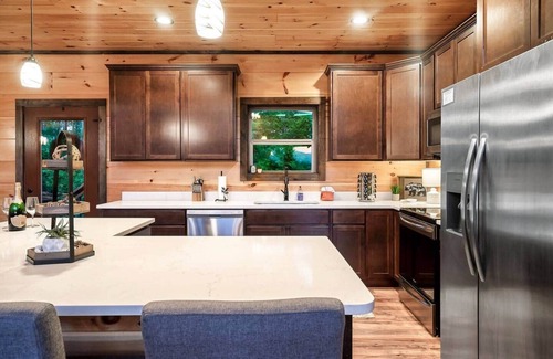 Welcome to Serenity Sunrise! A Luxurious Retreat with Stunning Mountain Views! Nestled in the desirable North Chalet Village, this 3-bedroom, 3-bath cabin can accommodate up to 8 guests and is perfect for family trips or getaways with friends. A Luxurious Retreat only 10 minutes to Downtown Gatlinburg, our cabin boasts superb amenities inside and out. The Great Room features a floor to ceiling stone fireplace, and incredible two-story windows provide million-dollar views while flooding the 1st and 2nd floors with natural light. There is a door to the deck complete with outdoor seating and dining as well as access to the hot tub, fire pit, and games below. The Gourmet Kitchen is fully stocked and comes equipped with stainless steel appliances, granite counters, and island bar that seats 5. The nearby dining table comfortably seats 6 guests. A Weber Gas Grill is available for the grill master of the house. To help start your day, we offer a complimentary coffee and tea bar complete with sugar and creamer. The Spacious Loft Game Room features an 8’ Pool Table, Shuffleboard, Pedestal Barrel Arcade loaded with over 3000 games and a Smart TV! Not your style, no problem! Relax on the game room sofa, play a board game, do a puzzle or grab a book from our wide selection. As our guests, you will have complimentary access to multiple outdoor pools, tennis courts, and more offered at Chalet Village North Clubhouse- all located within a few minutes drive from the cabin! Sleeping Arrangements for up to 8 guests: Main Level: * King Bedroom – Private en suite Full Bath * King Bedroom – Full Bath access Upper Level: * Master Family King Suite - Private en suite Full Bath with stand alone shower * Bunk Bed * Perfect for 2 guests, just the kids, or a family unit Expect high end memory foam mattresses, luxury hotel quality 100% cotton linens and sheets, closet and dresser storage options in all bedrooms. Amenities: - Newly built, Luxury Chalet with Panoramic Mountain Views - Great Room featuring a floor to ceiling stone fireplace and incredible two-story windows provide million-dollar views - Game Room with Shuffleboard, Pool Table, Multicade Arcade Games, and TV, pub table and seating area. - Board Games and Books for All Ages - Cornhole - High Speed 600mbps WiFi - Deck with views, outdoor seating and dining - Fully Stocked Gourmet Kitchen - Dining Table with Seating for 6 Guests plus seating for 5 at the large kitchen island - Hot Tub - 2 Fire Pits - Washer and Dryer - Pack n’ Play - High Chair - Parking for 4 Cars - 4 Miles to Gatlinburg - 7 Miles to Pigeon Forge Serenity Sunrise is unique from most properties in the area. In addition to deck space, we provide yard space to enjoy relaxing by the fire and games with family and friends. We are not a large property management company. You will be interacting directly with us during your entire stay, and we personally handle any questions or concerns. This is our family home away from home, and we would be honored for you to be our guest! We are conveniently located to all major attractions: • Downtown Gatlinburg and Anakeesta (10 minutes) • Smoky Mountain National Park (14 minutes) • Dollywood (17 minutes) • Ober Ski Resort (13 minutes) • Pigeon Forge (13 minutes) In addition, the cabin is just 10 minutes from the Gatlinburg Trolley pick up/drops off location. Drive to the pick-up point and you'll find a free parking lot. For a small fee, the trolley can take you to over 100 locations. **IMPORTANT** HOUSE RULES: * NO SMOKING OR VAPING OR PARAPHERNALIA ON PROPERTY- STRICT ENFORCEMENT * NO PETS * NO PARTIES OR EVENTS OF ANY KIND ALLOWED * GUESTS MUST BE AT LEAST 25 YEARS OLD TO RENT * QUIET HOURS ARE 10:00PM - 9:00AM **ANY VIOLATION OF THE HOUSE RULES AND AGREEMENT WILL RESULT IN IMMEDIATE REMOVAL FROM THE PROPERTY AND FOREFEIT OF ANY MONEY PAID. IF SMOKING OR VAPING HAS BEEN DETECTED, YOU WILL BE BILLED AN ADDITIONAL MINIMUM $500 CLEANING FEE. **TO FINALIZE THE RESERVATION, THE GUEST WILL BE REQUIRED TO SIGN A SEPARATE RENTAL AGREEMENT. YOU WILL BE ASKED TO SUPPLY YOUR EMAIL FOR THIS TO BE SENT VIA DOCUSIGN. NOTE: For the security of our guests and the safety of the cabin, we have an external security cameras (Ring) located at the front of the premise. It records video and audio. Cancellation Policy: 100% refund up to 30 days prior to arrival 50% refund up to 14 days prior to arrival *We do not offer refunds based on weather, illness, job loss, or emergency cancellations of any nature. We encourage purchasing trip insurance to cover unexpected changes to your trip. Frequently Asked Questions: 1. What Linens are included? – We provide linens for beds, bath towels, hand towels, makeup towels, wash cloths and beach towels for the hot tub. 2. What household supplies are provided? – We provide a starter kit that includes 2 rolls of toilet paper per bathroom and hand soap. Additionally, we'll also provide you with a roll of paper towels, dishwasher detergent pods, dish soap, a few trash bags, and laundry pods. You will need to purchase or bring additional items when the initial supply runs out. 3. What does the kitchen include? –The kitchen is fully stocked including a toaster, waffle maker, blender, crock pot, pots & pans, serving bowls and platters. We also provide a complimentary full coffee and tea bar. Regular coffee pot, Keurig, French press, a pour-over pot, and hot water kettle. Ground coffee, coffee beans, tea bags, creamer and sweetners are all provided. 4 Do you provide a grill? – Yes. A Weber gas grill located outside by the side of the cabin. 5 Do you allow pets? – No. We do not allow pets. 6. Is the hot tub cleaned after every stay? – Yes! Our hot tub is drained, cleaned, and refilled for every stay. 7. What time is check-in and check-out? – You may check in any time after 4:00 PM and you must checkout prior to 10:00 AM on the day of your departure. 8. How is the drive up to the cabin? - The roads are well maintained a