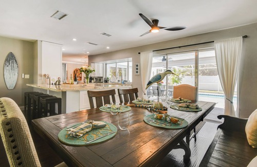 Brimming with contemporary style and all-new furnishings, this totally renovated 3BR/2BA gem in West Palm Beach is steps from the sand and boasts a private, heated backyard pool. Added highlights include an outdoor dining and seating area, a full-size pool table, and a gourmet kitchen.