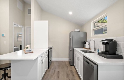 The upgraded kitchen features stainless steel appliances and all the utensils and cookware you need to create a homemade meal! We provide a Keurig coffee machine and complimentary coffee pods with sweeteners for your stay. Just inside the bathroom is the laundry closet with a washer/dryer machine and soap + dryer sheets.
