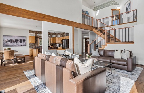 Enjoy time with your group around the fireplace sipping coffee or hot cocoa before walking out to the trails to explore the beautiful mountain ranges! There’s plenty of space to keep the cooks of your group company at our eat-in kitchen, stocked with appliances and everything you’d need to make a home-cooked meal. We provide towels and toiletries. There are 5 full bathrooms, offering plenty of privacy for larger groups. Our home is ideal for families, groups of friends, business getaways, etc.