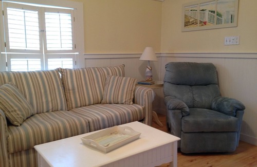 Recently remodeled with many new Cape-style furnishings and fixtures that will add great comfort to your stay, including expanded master bedroom and second bedroom as well as an all new bathroom! The master bedroom comes furnished with a queen bed and the second bedroom has two twin beds making for comfortable sleeping quarters for four. Sink into the reclining chair in the main room to watch your favorite TV show or ballgame. The pull-out sleeper in the main room offers additional options depending upon the make-up of your group.