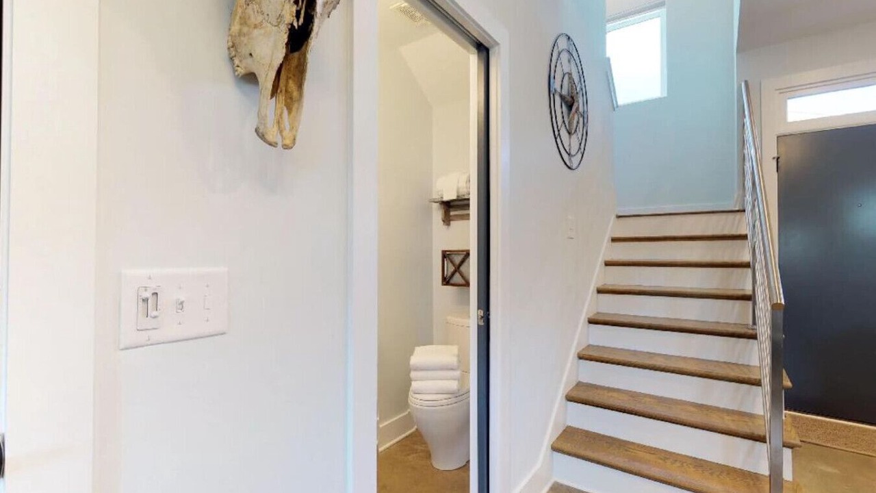 The second level features hardwood floors throughout two private bedrooms; each with a full bath. Each bedroom has a comfortable queen bed with warm upholstered headboards, and all the comforts of home. Each of the two full baths are outfitted with beautiful modern tilework and gleaming chrome fixtures.