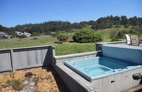 Cozy and comfortable beach cottage in the desirable south end of Sea Ranch. Two master bedrooms, each with king beds and ensuite bathrooms, large living and dining rooms with wood burning fireplace, gourmet kitchen, outdoor gas barbeque, vaulted wood ceilings, warm and sunny decks and beautiful views of a meadow, mountains, and sea. A stone’s throw from the Bluff Trail and the ocean and a short walk to Pebble and Black Point Beaches and the Sea Ranch Lodge. Located near the end of a quite, dead-end street, far from the highway. Recently enhanced with skylights, new hot tub and deck, wine cooler, appliances, carpet, furniture, granite countertops, updated bathrooms, flat screen TV's in bedrooms and living room, paid subscription streaming services including Netflix, Amazon prime video, Sling (orange and blue), and Paramount+, custom decorator touches and lots more. Reliable and fast high speed wireless access (100 mps, provided by Sea Ranch Connect) and Bluetooth ready surround sound system!!