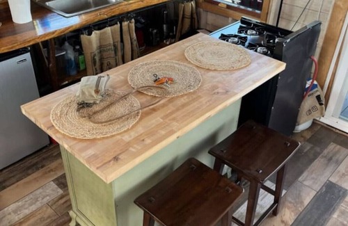 • Main house upstairs has full kitchen, dining area, comfortable Twin XL Day Bed, and outdoor seating area on wrap around deck