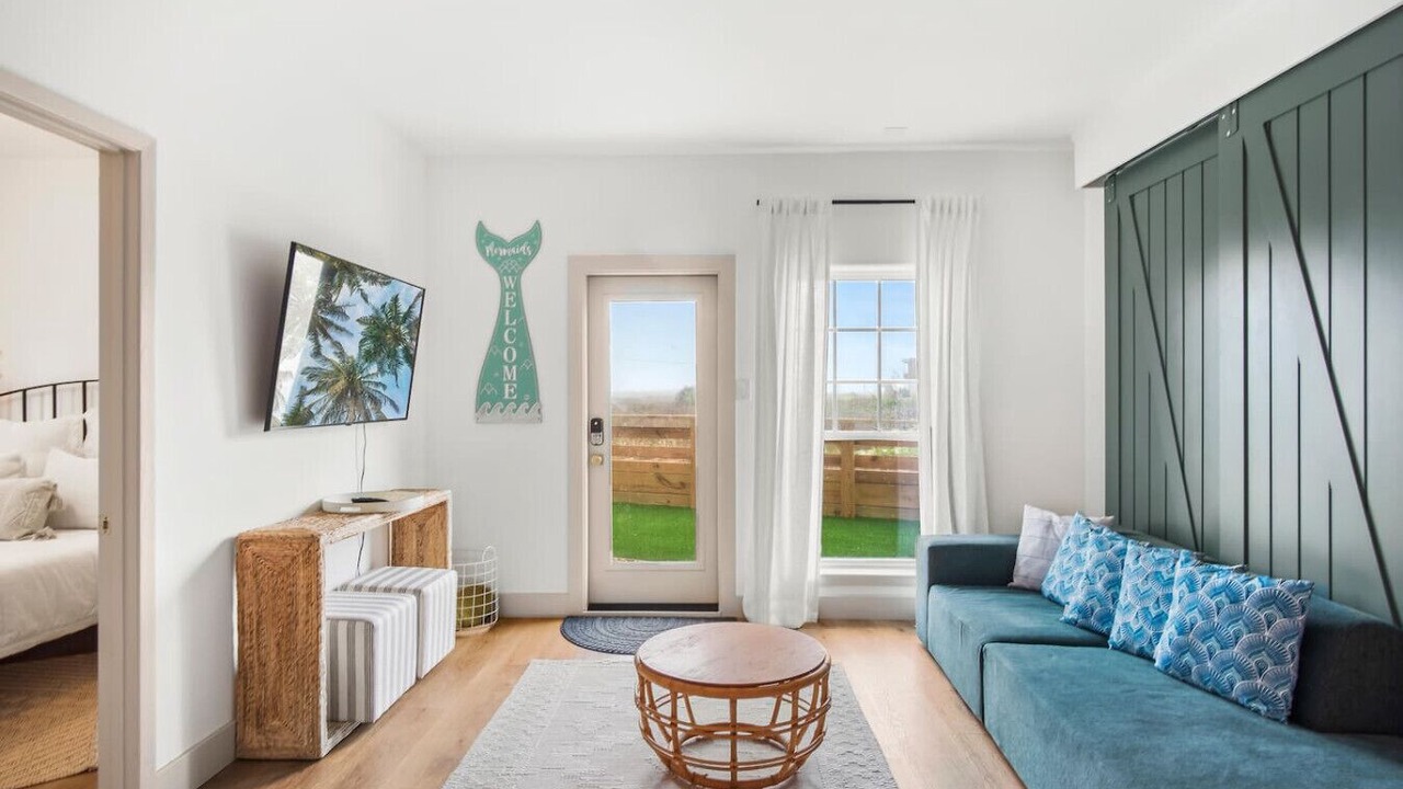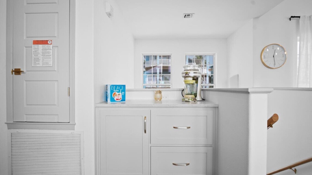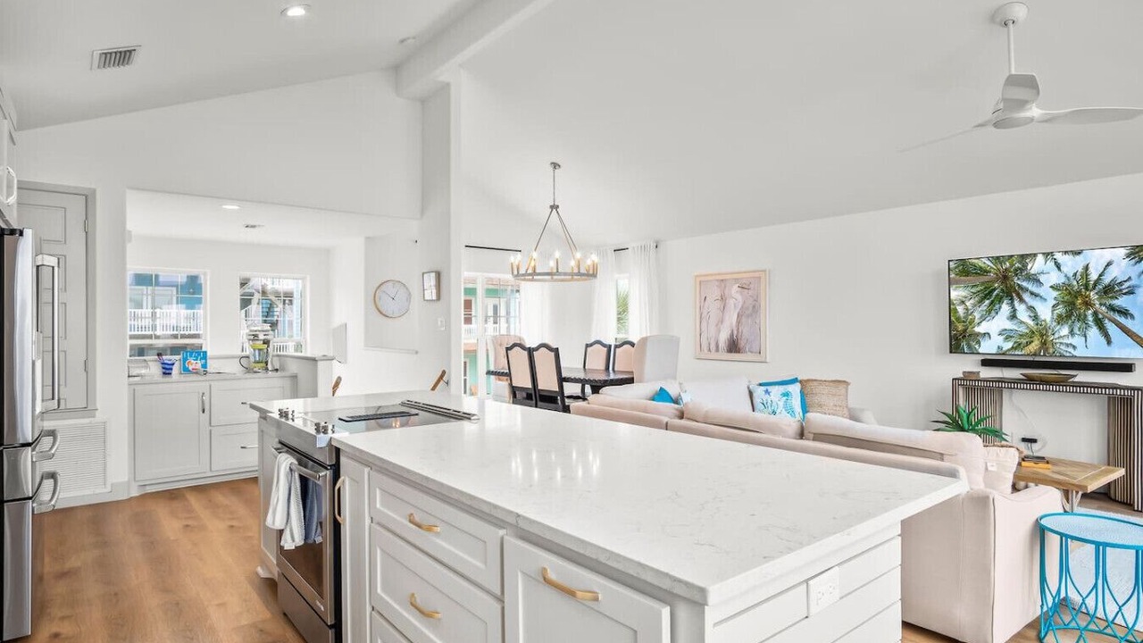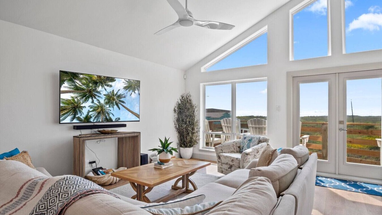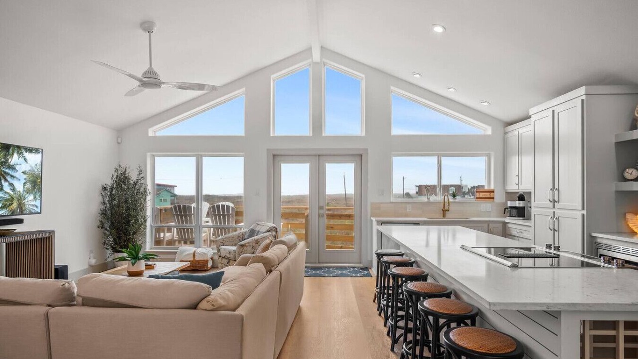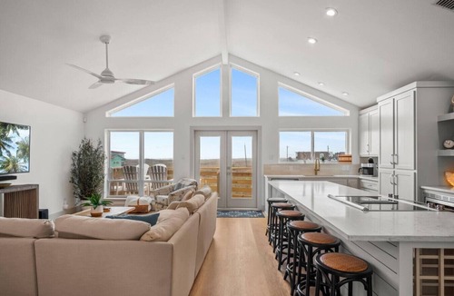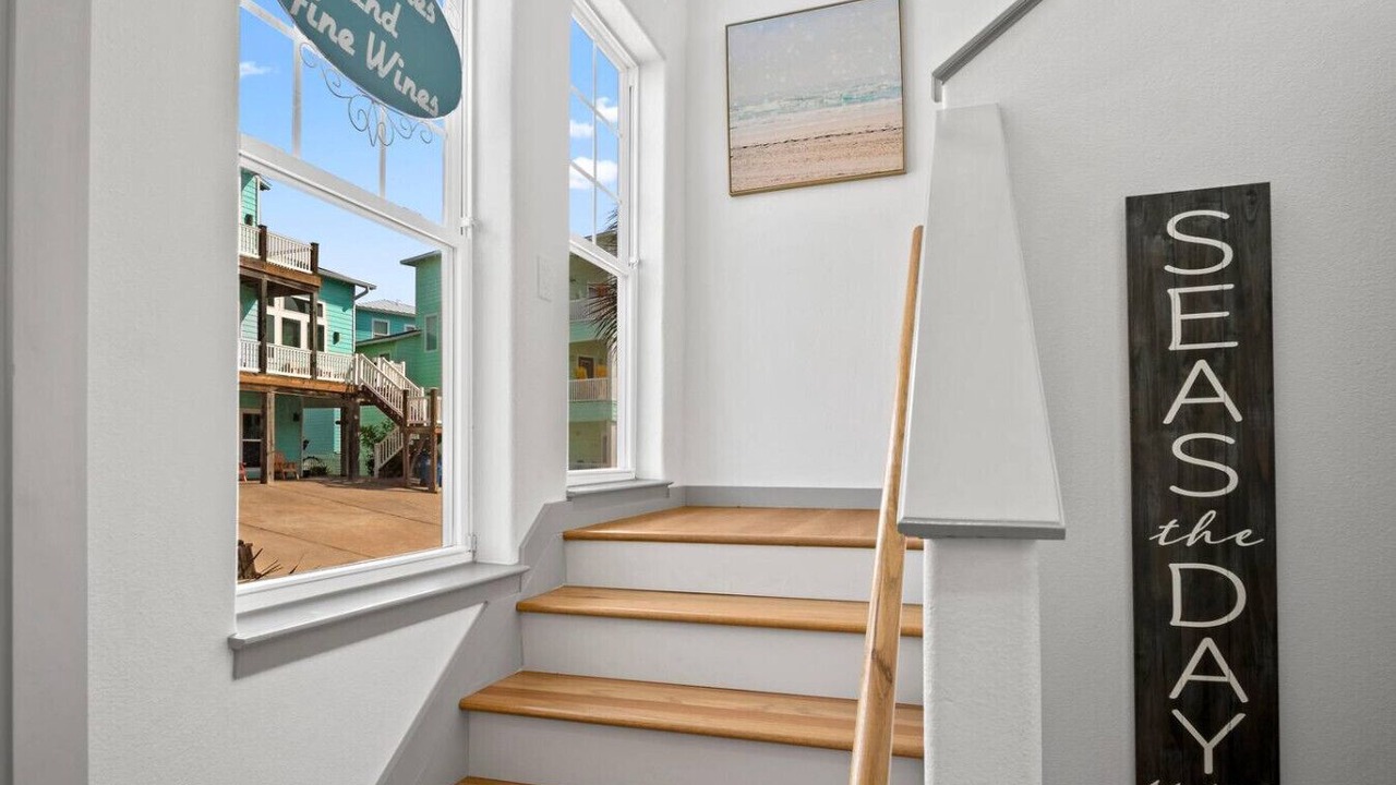 The second story of this home offers you a panoramic view of the natural beauty of Port A for the dunes, to the ocean. The kitchen in the second story has new luxury stainless steal appliances, designer cabinetry and beautiful quartz countertops. With an floor plan ideal for entertaining you will find an open living room, dining space, and kitchen area with a ten foot kitchen island and cathedral style ceilings. The living space has a large sectional sofa perfect for relaxing with family and friends after a long day at the beach, and a Smart HDTV where you can watch your favorite movie or catch the football game! The two bedrooms upstairs are perfectly designed. The master bedroom has a king sized bed that is literally build for a king, this room offer an en-suite bathroom for privacy that has a large soaking tub and shower. The second bedroom has a lush king sized bed and TV mounted on the wall to help you unwind after some fun in the sun. There is a full bathroom located down the hall as well as a laundry room with a washer and dryer for your convenience. This vacation rental home also offers two single air mattresses if you need additional sleeping accommodations.