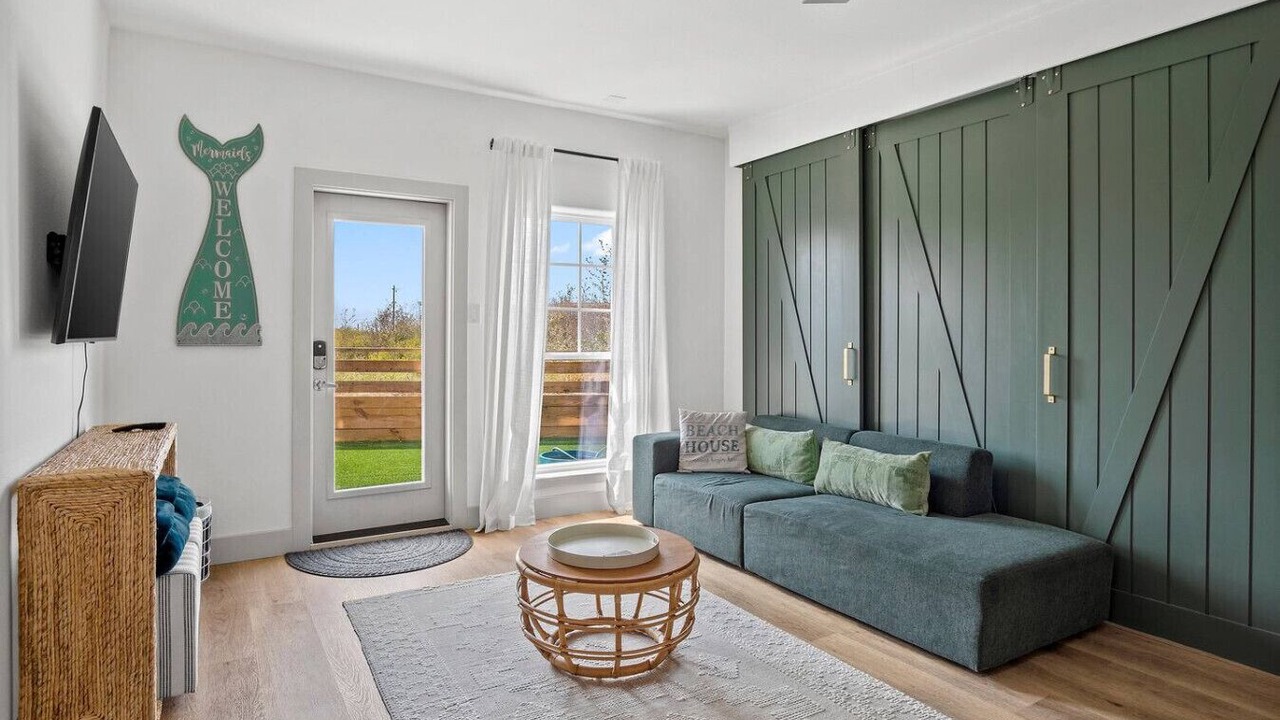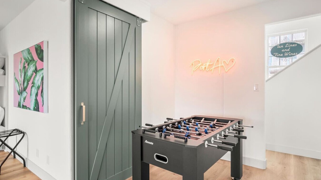 Enter this home and find everything you need for entertaining large groups, there is a second living room with a foosball table, a large Smart HDTV, as well as a game closet that is stocked with games for a game night and kid crafts to keep the little ones entertained. There are three bedrooms located on the first floor of this home. The first has a spacious queen sized bed with a Smart HDTV on the wall in the perfect location making it easy to relax and unwind. The second bedroom offers two cozy twin sized beds as well as a mounted Smart HDTV for late night movies. The third and final bedroom on the first floor is a bunkroom perfect for the kiddos with two built-in twin sized bunk beds and oversized barn doors to close for privacy at night. There is a bathroom located on this floor for your convenience.