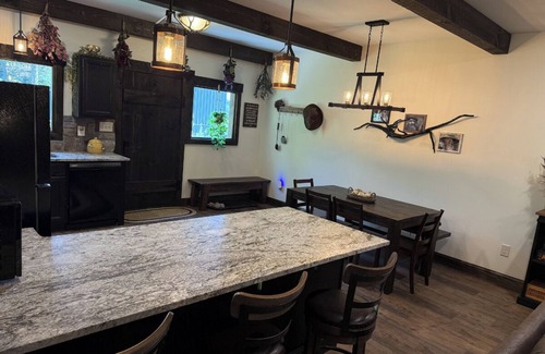 Designed with gathering and connection in mind, the kitchen is both charming and functional, perfect for preparing everything from a hearty mountain breakfast to a feast worthy of Rivendell. Well-appointed with a full-sized refrigerator, dishwasher, stove, microwave, and other kitchen appliances perfect for making breakfast, lunch, or dinner throughout your stay! All pots, pans, glasses, plates, silverware, etc are also there for you. Gather around the inviting dining table to share stories and laughter, as it invites you to savor each bite while imagining the whimsical journeys of your favorite adventurers.