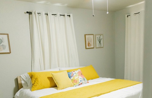 This bedroom host a king-size bed with a comfortable mattress and four hotel-quality pillows. The bedroom comes with two side tables that have USB ports on both of the lamps. You have plenty of storage in your closet to hang your clothes!