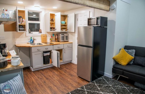 Outside you'll be able to enjoy a yard, and a porch with seating, and a bbq. Inside is a welcoming farmhouse style cabin with butcherblock counter tops, rustic beam, vinyl plank flooring, and carpet upstairs to the loft. The kitchen is stocked with the essential utensils and basic spices, condiments and cooking oil. With place settings for four, you can choose to stay in, or go out on the town. There's plenty of towels in the bathroom, shampoo and soap, as well as a hair-dryer if you don't want to pack your own.