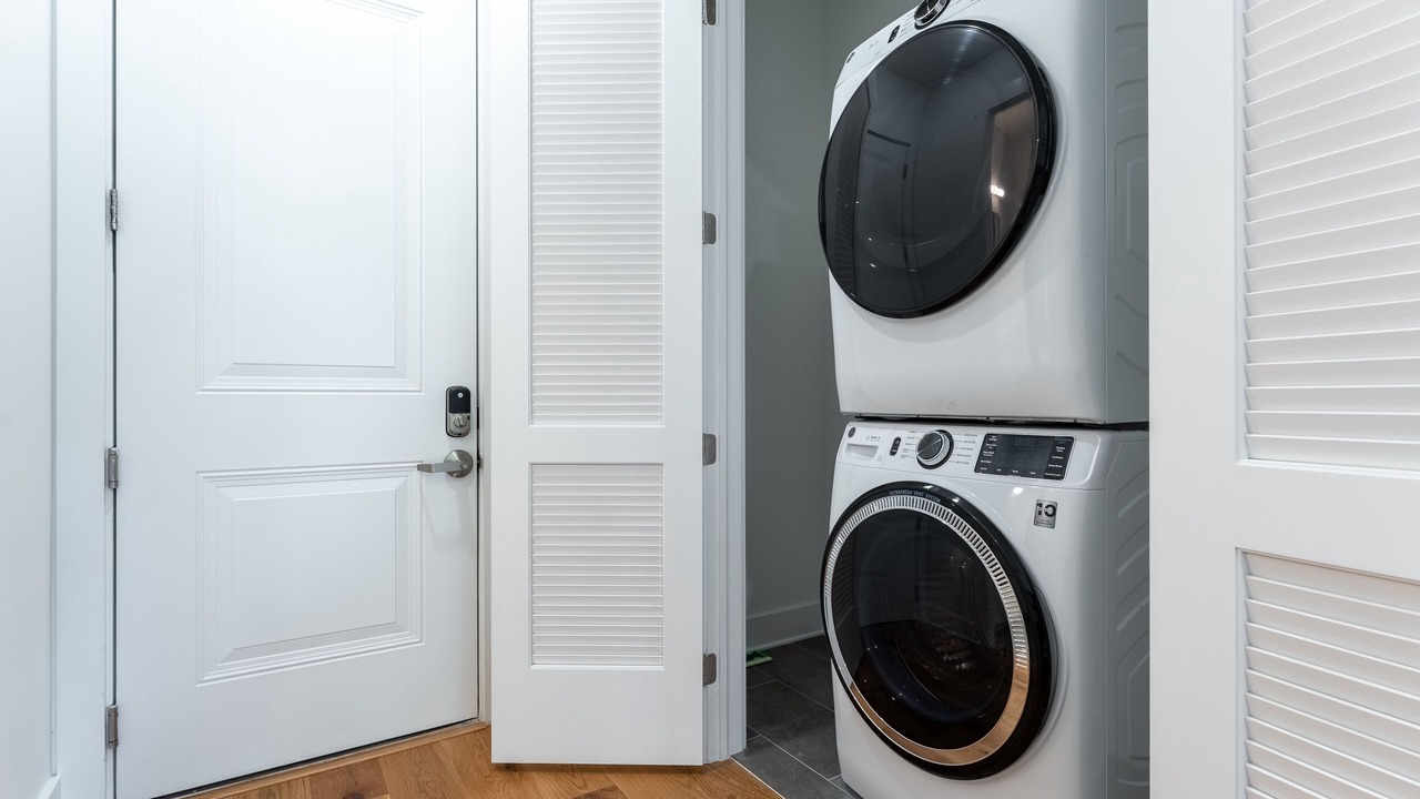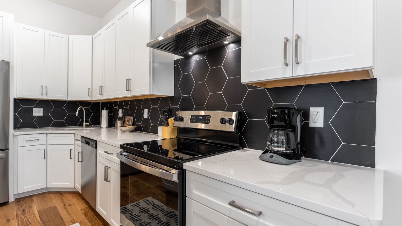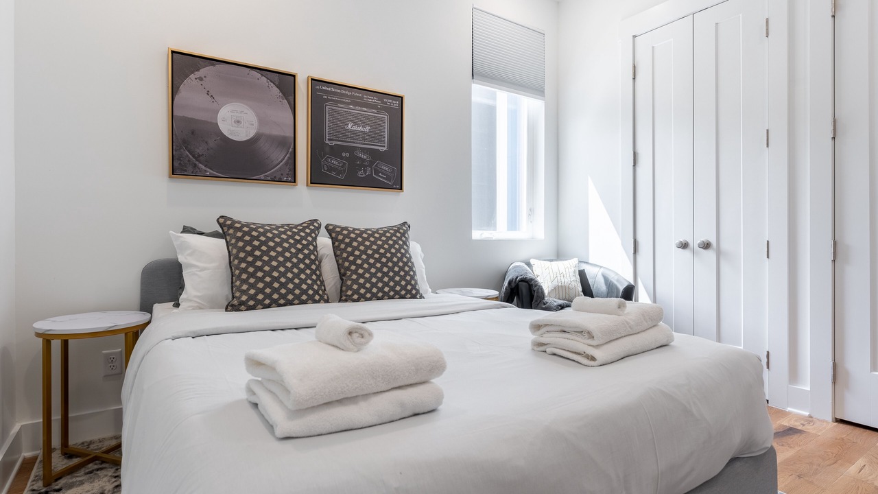 This stunning spaces opens into an open concept floor plan with a luxurious kitchen and sun filled living room. The washer and dryer are located in the hallway of the main entrance. There is a cozy balcony off of the main living area. The primary bedroom features a queen bed, and an en suite bathroom with walk-in shower. The second bedroom features a full/double bed, a twin day bed, and an en suite bathroom with a shower/tub combo.