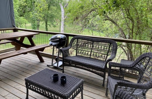 This cabin is one of 24 cabins at Son's Rio Cibolo Ranch, a 100-acre nature resort with 2 miles of gorgeous creek frontage! It's hard to find a prettier more peaceful creek than Rio Cibolo Creek, it is spring fed, has gorgeous water, always flows and is close to the same temperature year-round!