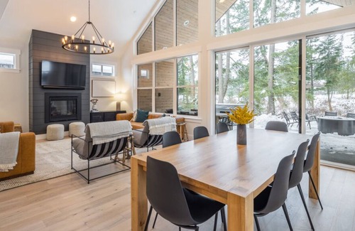 This cabin has a stunning free-flowing design from the kitchen, dining and living areas enhanced by large windows and a fireplace. The dining area can seat eight people comfortably and the gourmet kitchen offers island seating for an additional three. The kitchen boasts all the stainless-steel appliances needed for a home-away-from-home experience.