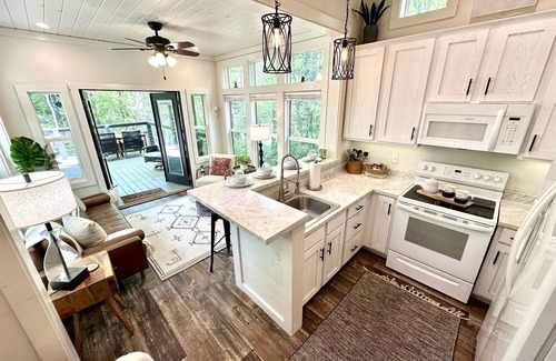 This well appointed home is located in Tennessee's 1st tiny house gated community. 1 acre lot- private on all sides. 500 square feet of decking to enjoy the outdoors. You can hear the serene sounds of the falls from the deck. Professionally landscaped with flagstone firepit.